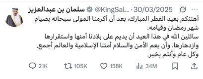 محتوى العيد أصبح جزء رسميًا مهمًا في كثير من الحسابات، وفي مقدمتها الحساب الرسمي لخادم الحرمين الشريفين الملك سلمان بن عبدالعزيز، والجهات الرسمية، والوزارات، وحتى كبار المسؤولين، يتعاملون مع محتوى العيد بوصفه جزءًا رسميًا ومؤثرًا في حساباتهم، تهنئة رقمية، تصميم خاص، فيديو معايدة؛ كلها رسائل مدروسة تعكس حضورًا وتواصلاً مباشرًا مع المجتمع، لم يعد محتوى احتفالي فقط، بل أصبح جزءًا من الخطاب الرسمي.